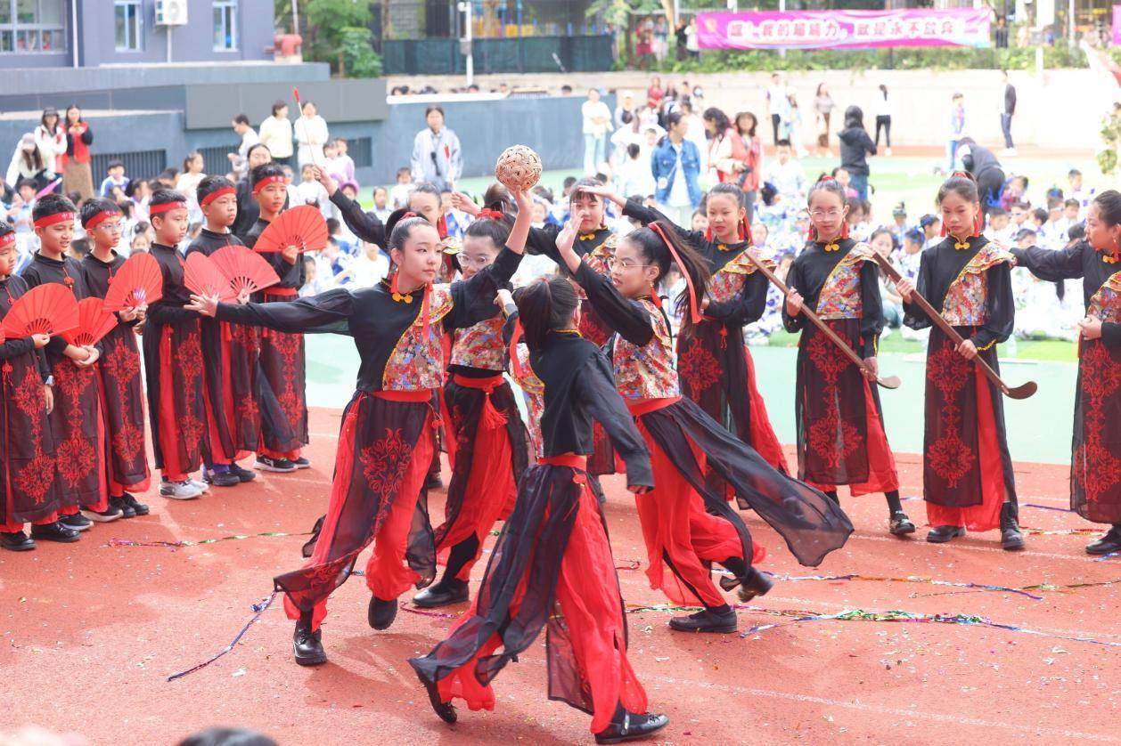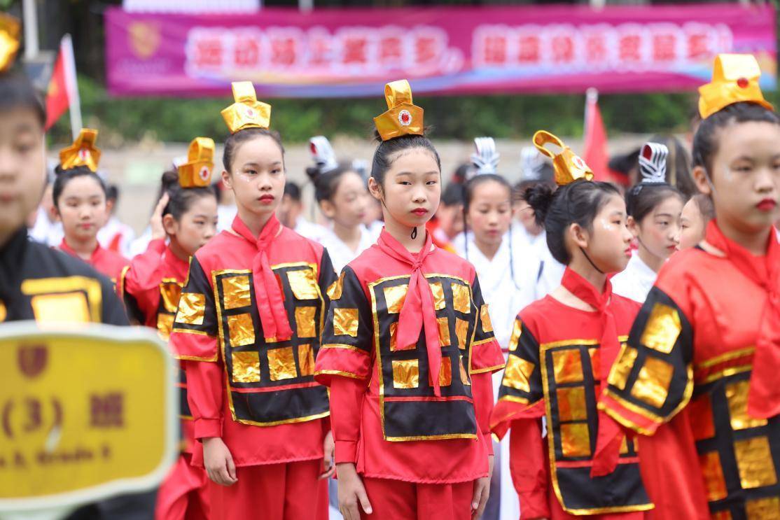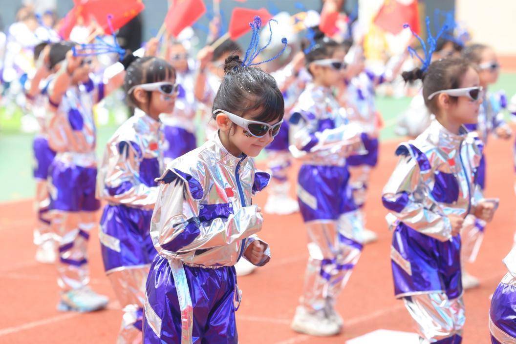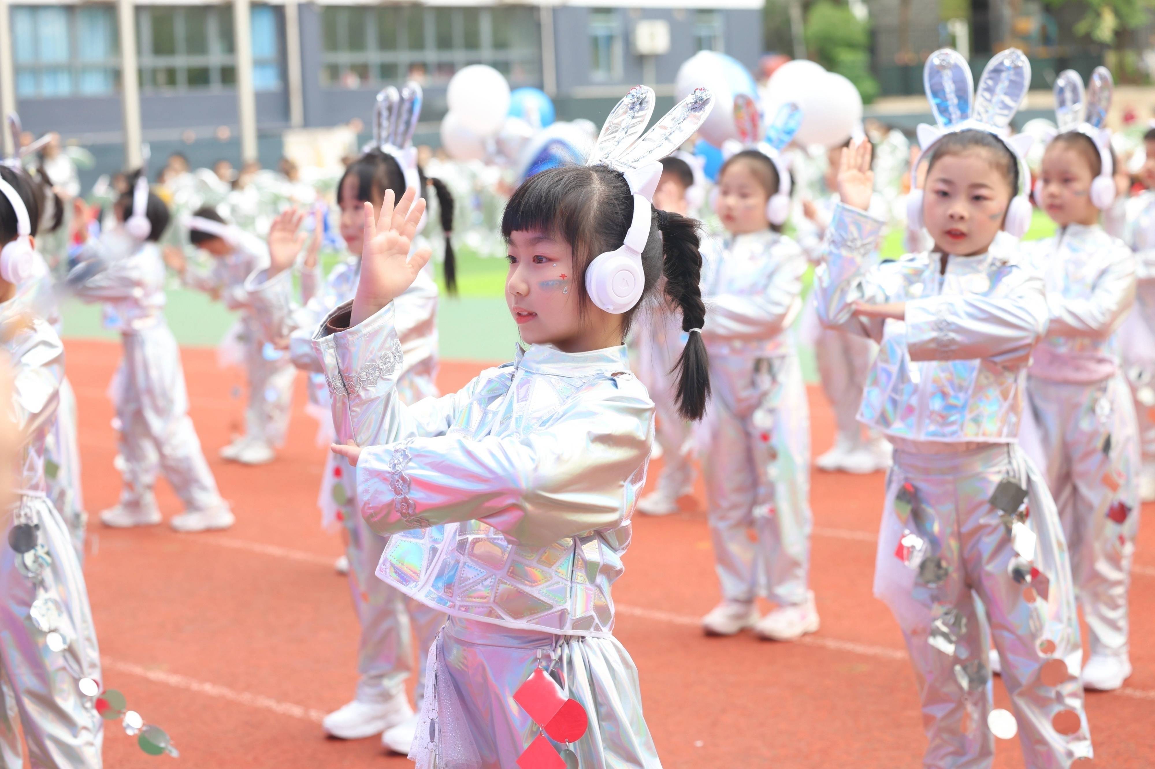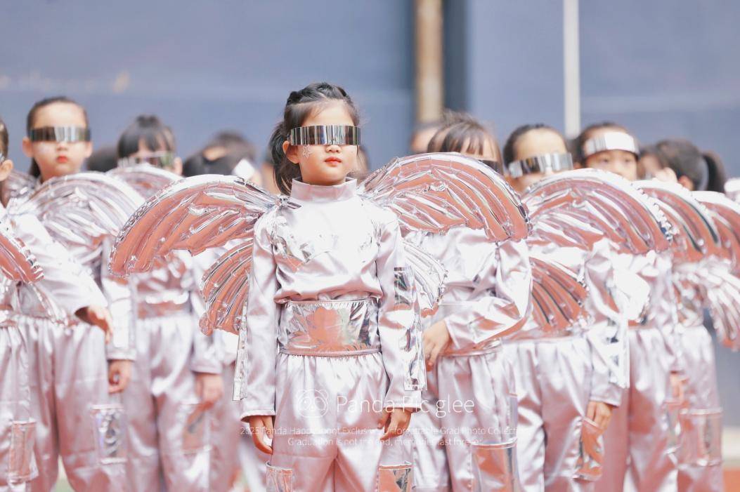 各年级方阵依次亮相,创意纷呈、主题鲜明:一年级以“机器人总动员”为主题,孩子们身穿机甲服饰,手持机器狗道具,展现对科技的浓厚兴趣;二年级聚焦“智慧生活”,生动演绎智能家居、导航出行等场景,传递勤学善思的品质;三年级化身为“太空漫步者”,借助充气火箭、战机模型等道具,抒发航天梦想与探索精神;四年级以“未来指挥官”为定位,展现团队凝聚力与科技强军理想;五年级则跨越时空,以岳飞、花木兰等历史人物造型与唐装演绎,融合家国情怀与拼搏精神;六年级以“AI未来赛”为主题,通过AI设计的“天马战衣”、数据流彩带等元素,为小学阶段最后一次运动会增添科技色彩。