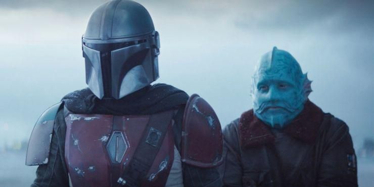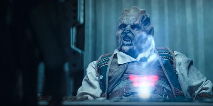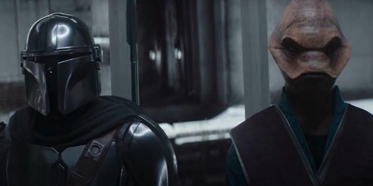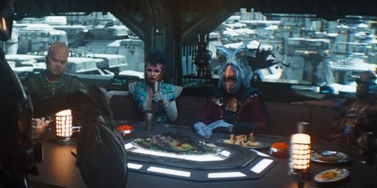 丁·贾林将卡巴·贝兹的首级交给了一个神秘的客户,这个客户好像正在举办某种派对,一群熟悉的《星球大战》外星人混在客人中间。当曼达洛人走进来的时候,出现了一个三眼的祖母——在《绝地归来》中,作为贾巴暴民的一员,这个物种与克拉图恩人一起首次登场。然后,曼多走过一个像蝙蝠一样的查德拉范物种,它可以追溯到新希望的标志性的莫斯·艾斯利酒吧。丁·贾林的雇主是一位伊什蒂布,还有一位乌贼模样的夸伦人和一位紫色皮肤的特林物种,这三个物种都来自《绝地归来》。