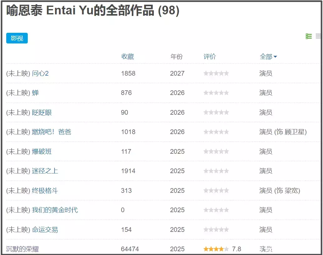 虽然喻恩泰在内娱称不上大红大紫,但参演过太多经典作品,从《武林外传》到《大秦帝国》,手握不止一个经典角色,2025年,他还出演了央视爆剧《沉默的荣耀》。