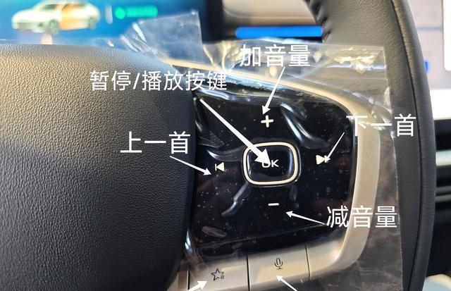 右侧方向盘功能就比较常规,是多媒体音量、上下曲、语音的唤醒控制。没有啥特殊的功能。