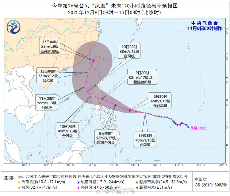 预计,“凤凰”强度快速增强,最强可达超强台风级(55-65米/秒,16级-17级以上),逐渐向菲律宾吕宋岛东部沿海靠近,穿过吕宋岛后强度减弱,将于10日中午到夜间移入南海,之后逐渐转向偏北方向移动。
