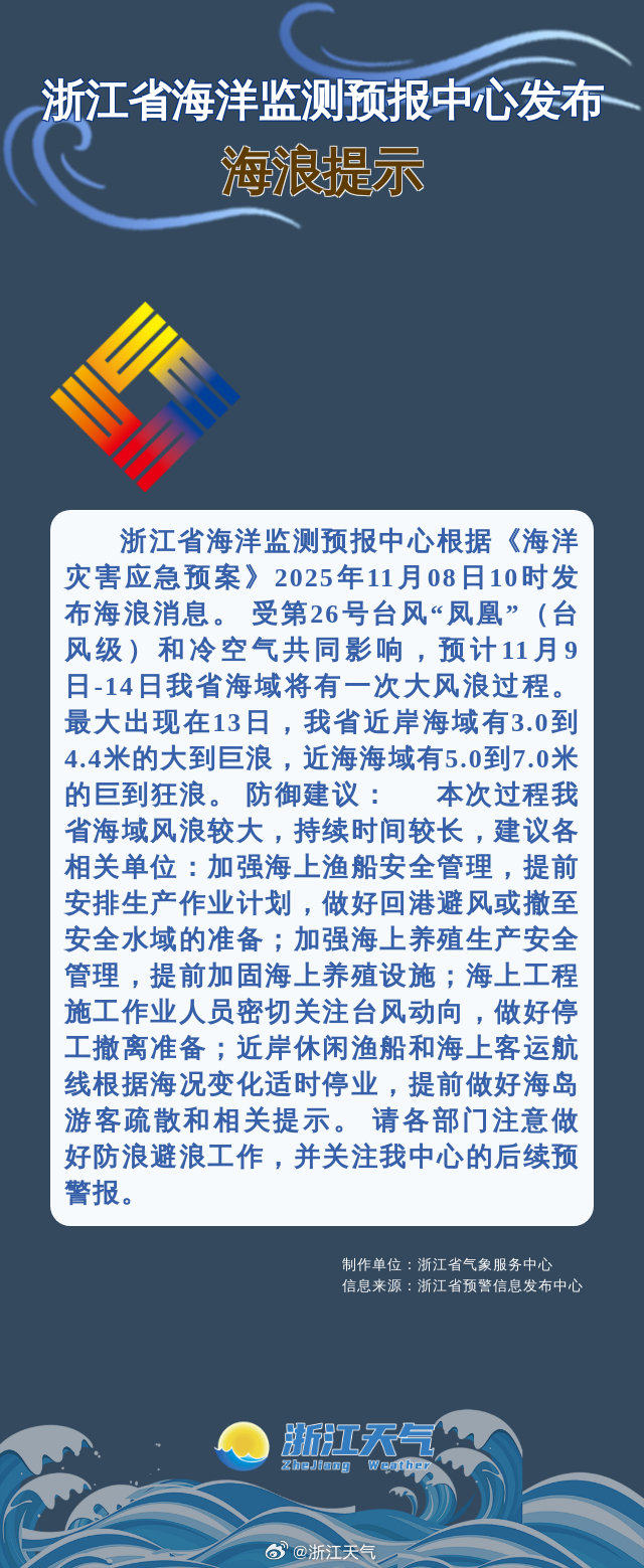 11月8日,浙江省海洋监测预报中心发布了海浪提示。