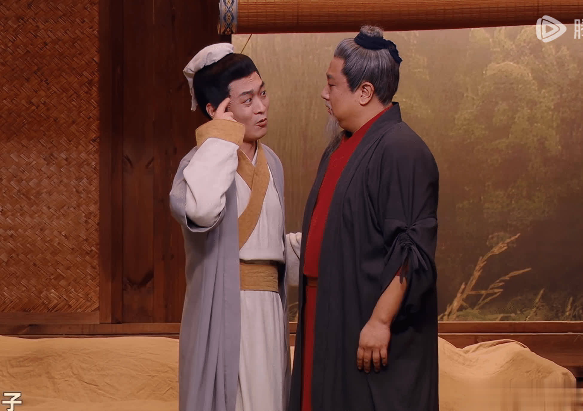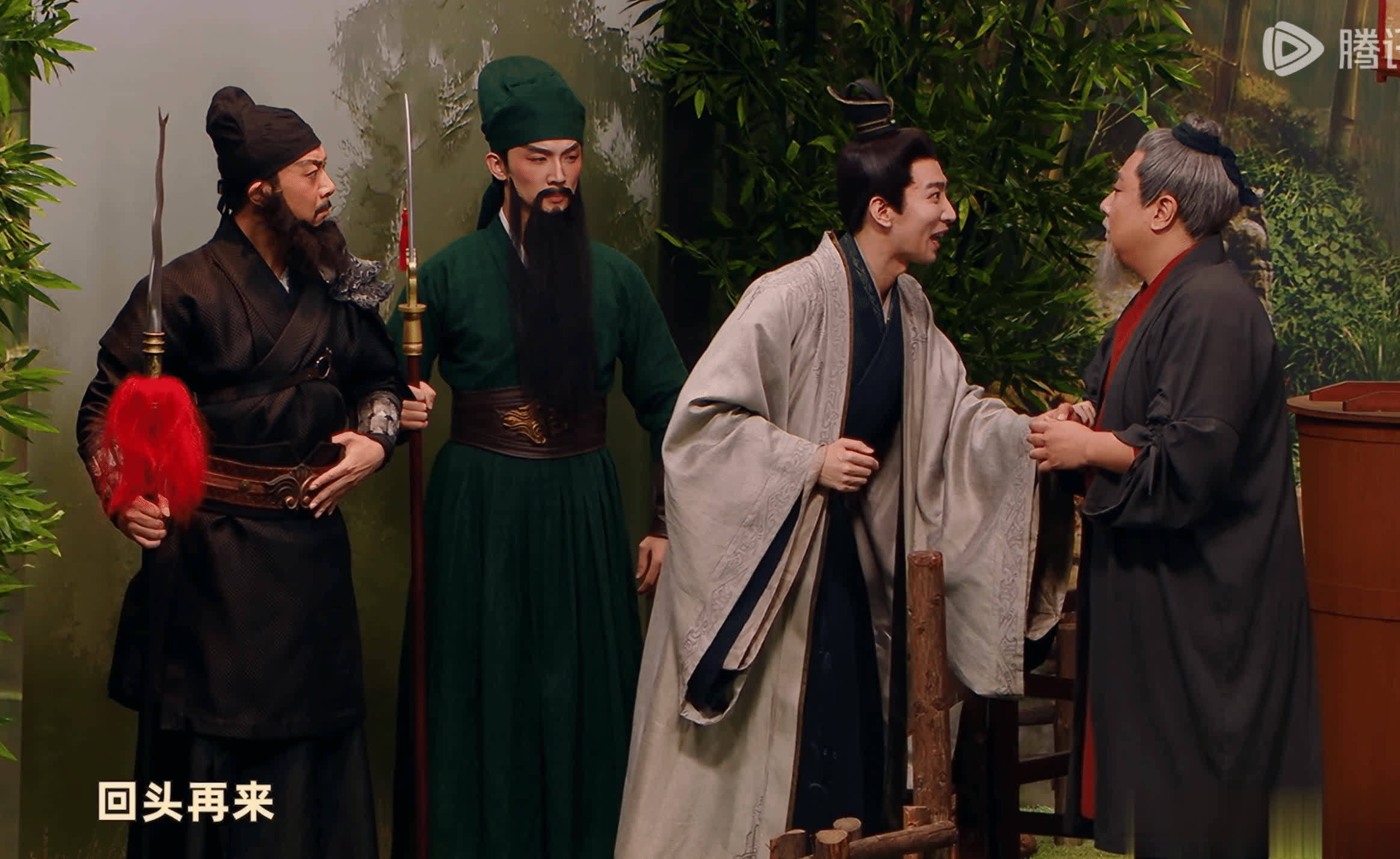 《三顾茅庐》中,张弛演的刘备说自己“回头再来”,然后转了个身就又来了;这个包袱在悟空里也用过。叶浏跟蒋龙一起争取演孙悟空,张弛让他们回头再说,于是这两人就回了个头。