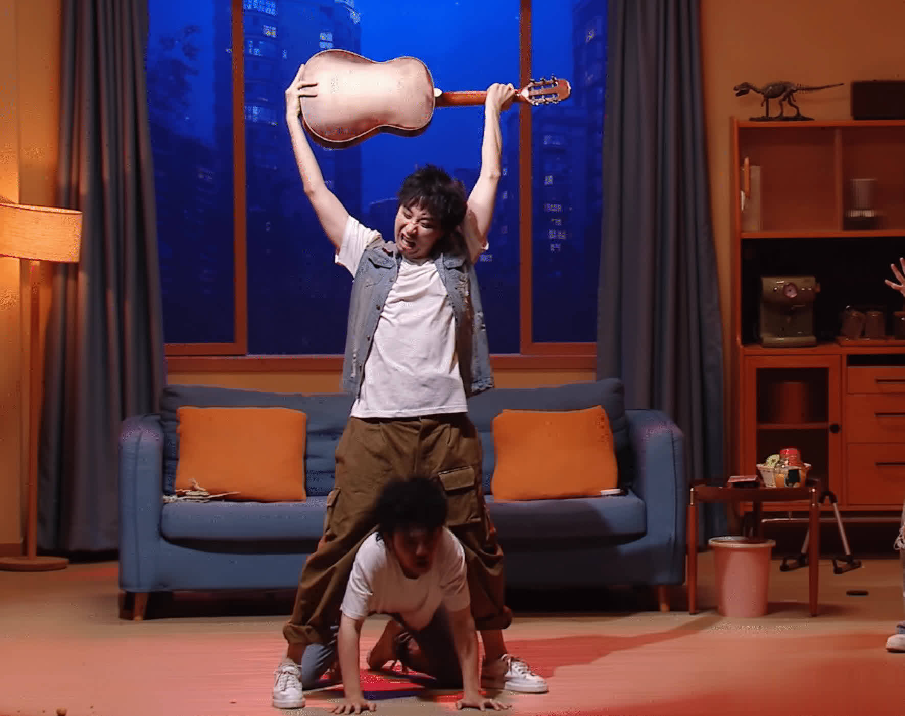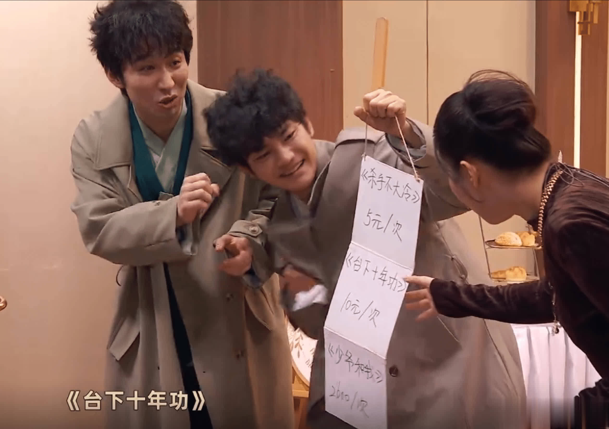《项总今天为何这样》里,蒋龙张弛扮演的就是一喜的逐亚,上来跳的是《女友来了》里的舞蹈,拿出来的节目单,除了《杀手不大冷》和《台下十年功》,还有《少爷和我》。