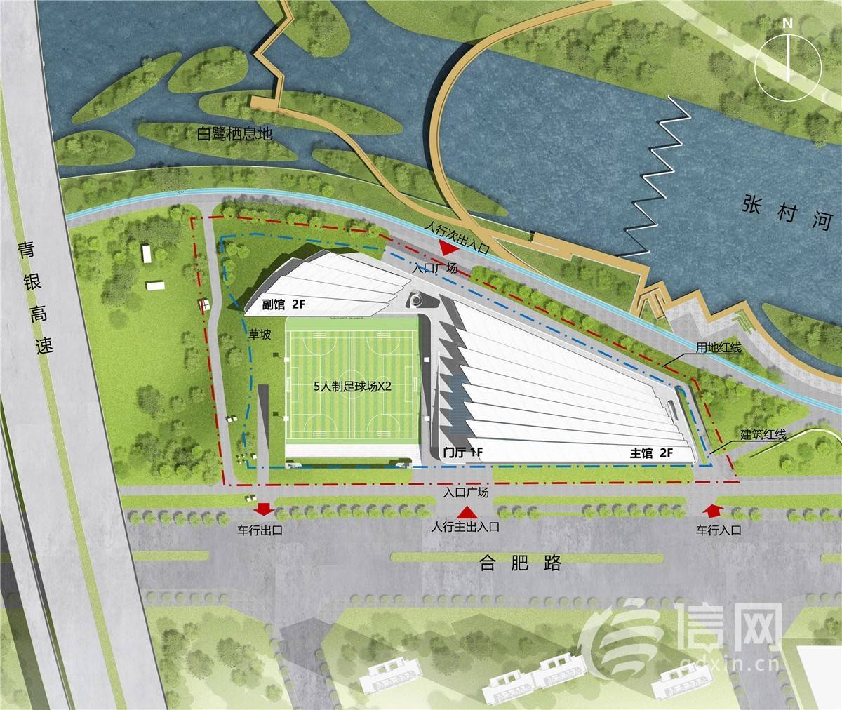 据了解,项目规划用地18343.40平方米,规划总建筑面积约22796.79平方米,其中地上建筑面积约9132.91平方米,计容面积约9157.99平方米,地下建筑面积约13663.88平方米。规划主馆与副馆两个建筑,建设内容室内包括篮球场、羽毛球场、乒乓球场、游泳池、健身房等,室外包括足球场、观鸟平台等。项目容积率0.5,绿地率35%,此外还规划地下停车位184个。(信网记者)